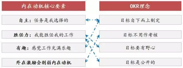 1、OKR强调自下而上制定,让员工有基于自己兴趣和特长选择工作的自由,这正好体现了内在动机里的“自主”要素;