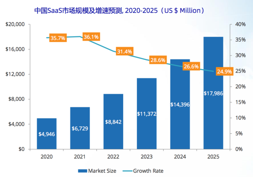 但是,根据IDC的报告,2020年中国公有云服务市场整体规模达到194亿美元,同比增长49.7%;并将在未来5年,保持29.5%的年复合增长。因此,中国SaaS产业潜力巨大,未来必将涌现出更多的独角兽公司。