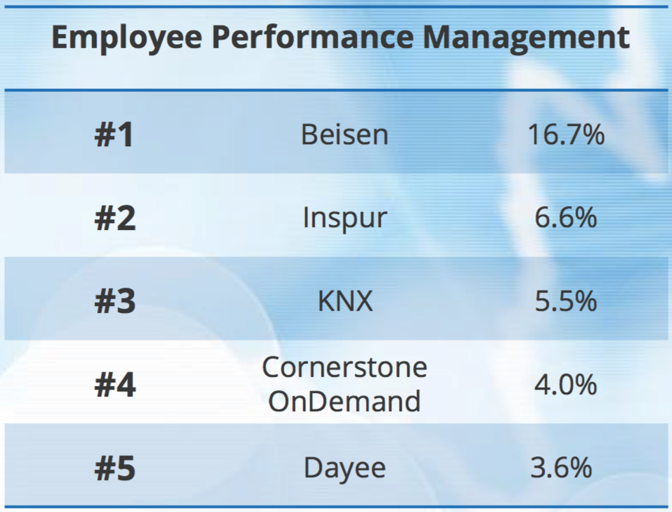 尤其是在核心人事(Core-HR)、绩效(Employee Performance Management)和招聘(Recruiting/Talent acquisition)三个板块,北森分别以13.4%、16.7%和18.1%的占有率成为细分市场的第一名。要知道,这三个板块占了整个中国HR SaaS市场60%以上的份额。