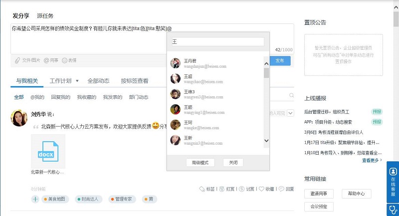 企业社区,员工可以在线发布分享,快速@相关人员以及公司内专家,搜集反馈意见,其他人可以在线反馈,可以打赏,可以给予标签,提升跨组织团队的沟通与协作。