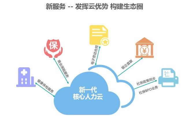 北森新一代核心人力云除了人员信息的记录、薪酬、考勤的自动计算,入、转、调、离业务处理,还包括以员工为中心的健康管理、商业保险、积分管理等员工服务,新技术驱动的智能服务,以及与生态伙伴合作为客户电子劳动合同、银企直联、社保政策的及时同步等新服务。