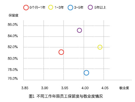 从保留度角度中看,工作年限5年以上的员工表现出较高的保留度,这类人员往往对企业会表现出高的忠诚性。图1