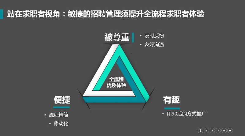 第二、强调效率。在唯快不破的时代,招聘效率直接影响着招聘结果。我们是否搭建了自己的招聘管理系统?我们是不是为求职者提供了便捷的应聘渠道?