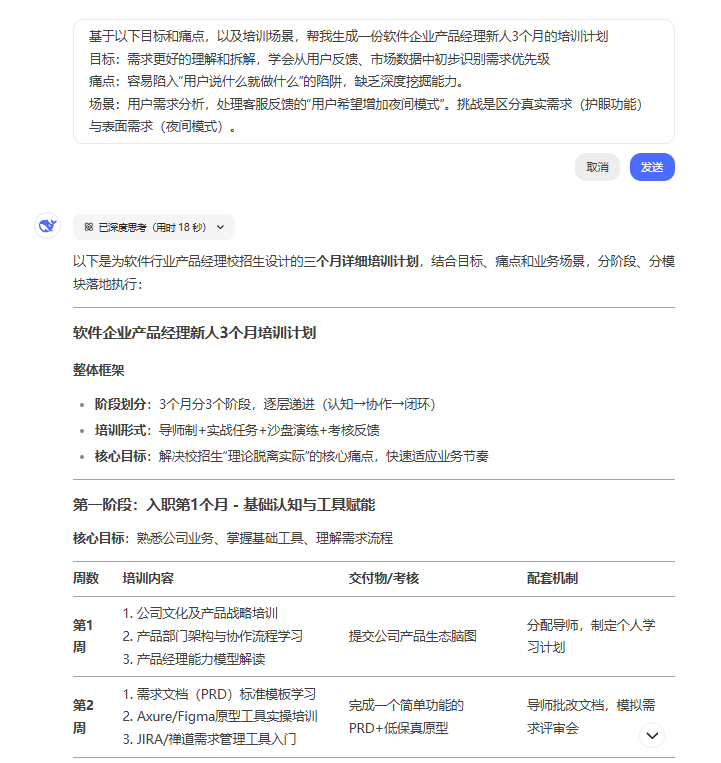 同样的道理,我们要像DeepSeek一样思考,做企业计划我们需要考虑的问题有哪些?培训需要达到什么目标呢?一般来讲,培训计划需要知道做该培训的目标、以及基于该目标下的痛点是什么?具体场景有哪些?然后让DeepSeek来输出提示词。